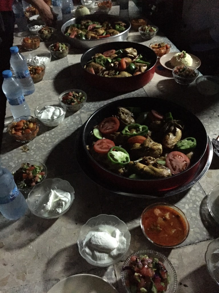 The meals were something to behold! Lunch was served on site, in the front room of the house next door. I didn’t take any pictures of that. But each night for dinner we would go to another persons home to eat. It was a completely mind boggling spread: